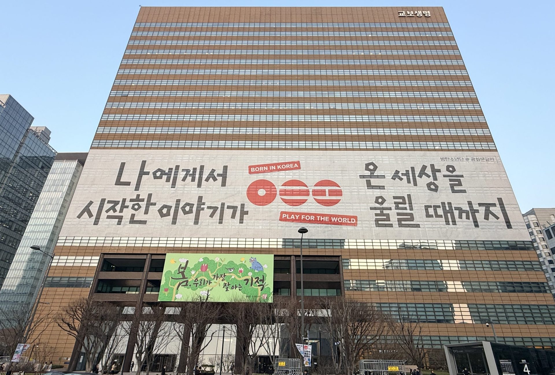 - Kyobo Life Insurance Building: The gigantic wrapping banner reads, “Until the story that started with me echoes across the whole world,” and “BORN IN KOREA, PLAY FOR THE WORLD.” Our hearts swell at these phrases that perfectly summarize the identity of this 5th full-length album, making a comeback with our traditional ‘ARIRANG’.