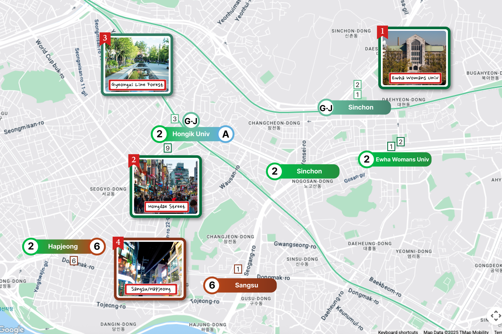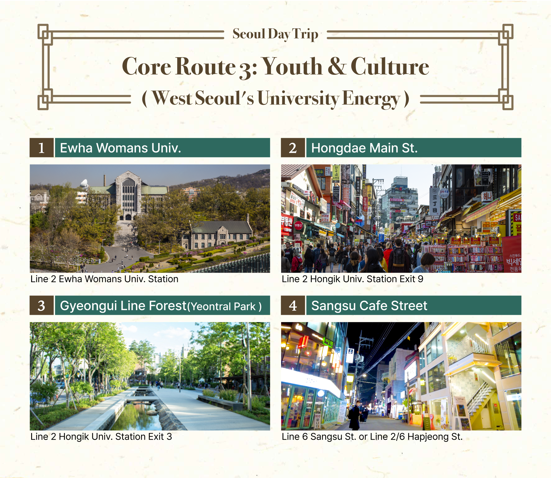 | Course Theme | Exploring the youthful streets, indie music, street art, and trendy cafés/shopping around Ewha, Sinchon, and Hongdae. |